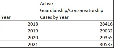 Update: Some 2,991 new cases were filed in 2022. At the end of 2021, there were 30,537 active guardianship cases in the state, reflecting an increase of 2,121 active cases since 2018.