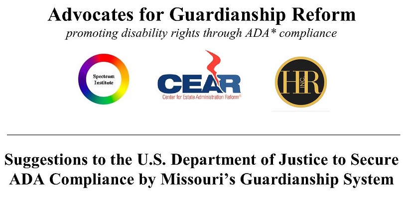 click here. The DOJ is holding a zoom meeting to discuss the matter and announce next steps. To attend the zoom on Tuesday, June 25th at 6:00pmCT/7:00pmET, click here. To attend the meeting on Wednesday, June 26th at 12:00pmCT / 1:00pmET, click here. The DOJ is soliciting comments on how it can address these violations. To make suggestions, write to: Community.Missouri@usdoj.gov. The Alternatives to Guardianship Project, along with Spectrum Institute and the Center for Estate Administration Reform, are submitting the following recommendations.