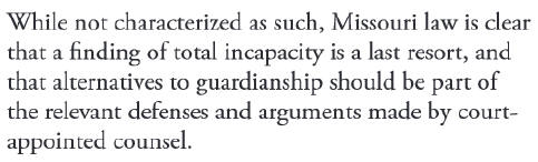 The article spells out in considerable detail the rights of such adults in guardianship proceedings. One of them is the right to have counsel who advocates for their wishes and protects their rights. One such right is to have appointed counsel seriously explore less restrictive alternatives and to argue for such, including demanding an evidentiary hearing or jury trial on the matter if necessary. What the article does not address, however, is the extent to which such attorneys are doing this in actual practice. Nor does it address how attorneys are impeded in providing such advocacy because they are often paid a flat fee of a few hundred dollars which, in effect, puts them in a bind and creates an actual or apparent conflict of interest. Put in three hours and earn about $150 per hour or put in more hours and perform the extra work for free.