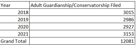 Update: Some 2,991 new cases were filed in 2022. At the end of 2021, there were 30,537 active guardianship cases in the state, reflecting an increase of 2,121 active cases since 2018.